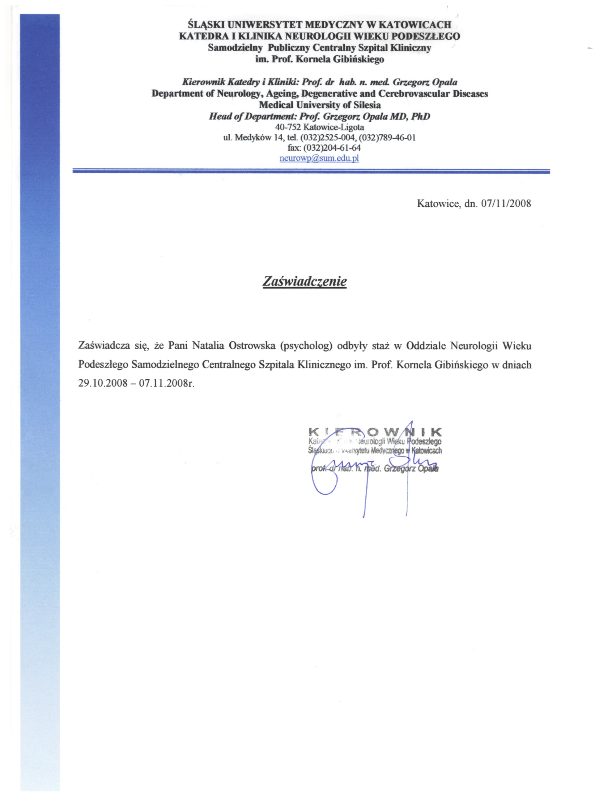 Проходила стажування на кафедрі клініки неврології похилого віку (Prof. Grzegorz Opala MD. PhD) м.Катовіци, Польща – нейропсихологічна діагностика нейродегенеративних захворювань.