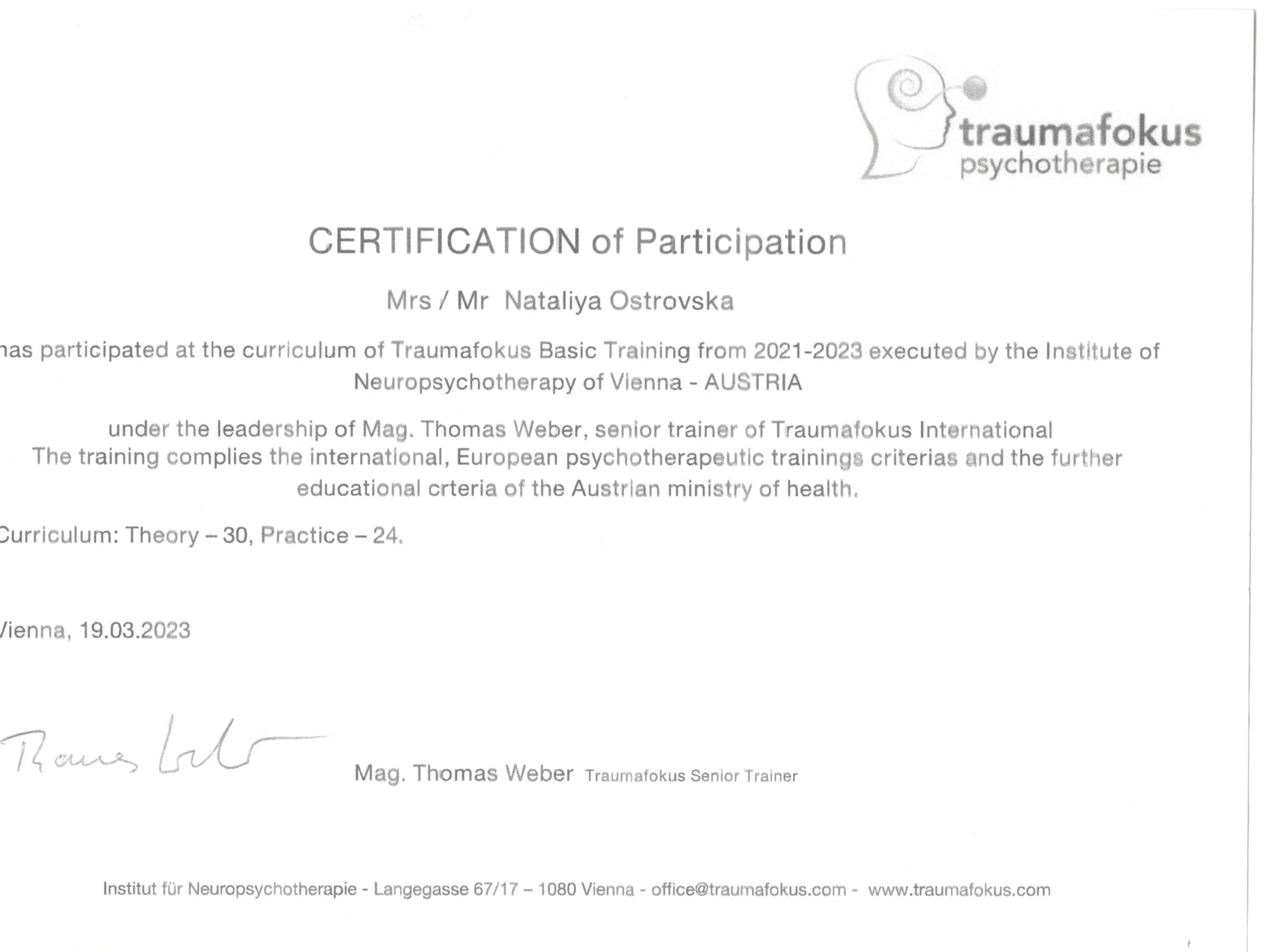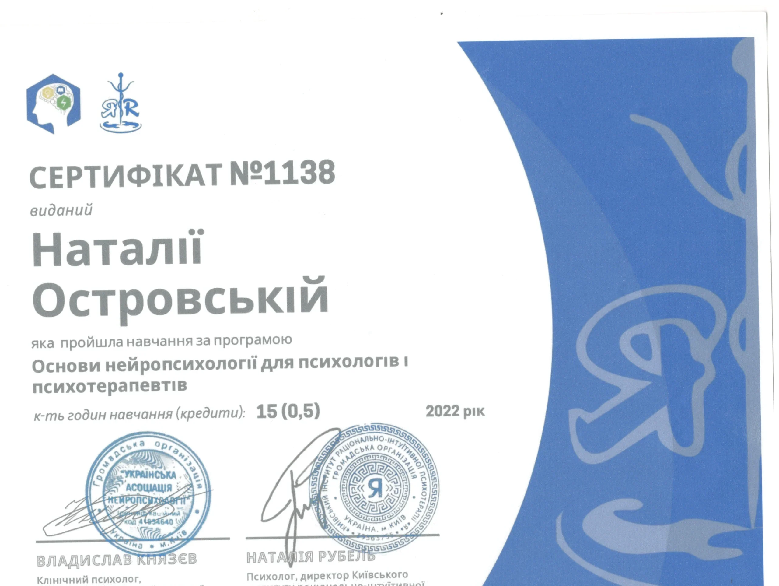Пройшла курс вдосконалення психологів: “Нейродегенеративні хвороби: нейропсихологічна диференційна діагностика”, м.Варшава, Польща. Пройшла курс навчання за програмою “Основи нейропсихології для психологів та психотерапевтів”.